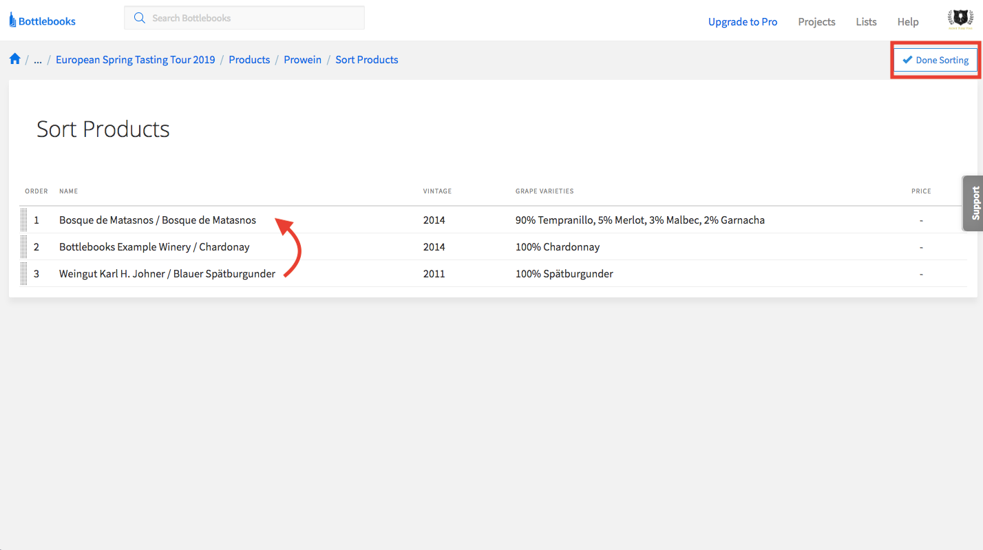 2. Click on the wine and drag it to the position you want it in. When finished, click on "Save," then "Done Sorting" in the top right.